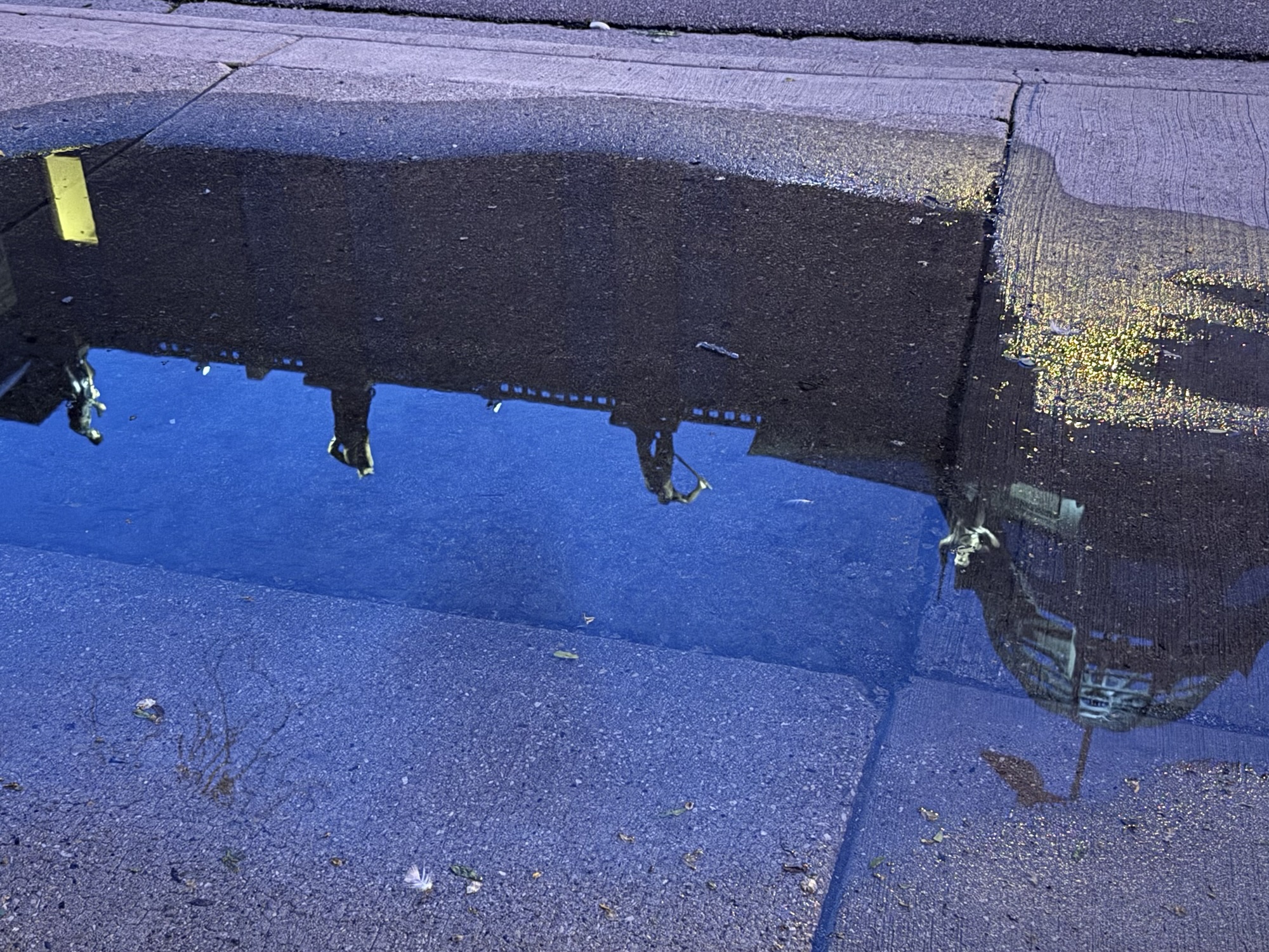 Recently, when I left the building after class ended on a night when it had rained almost all day long, there was a puddle across the street in that same spot on the sidewalk where I had managed to get the photo of the museum in 2016.