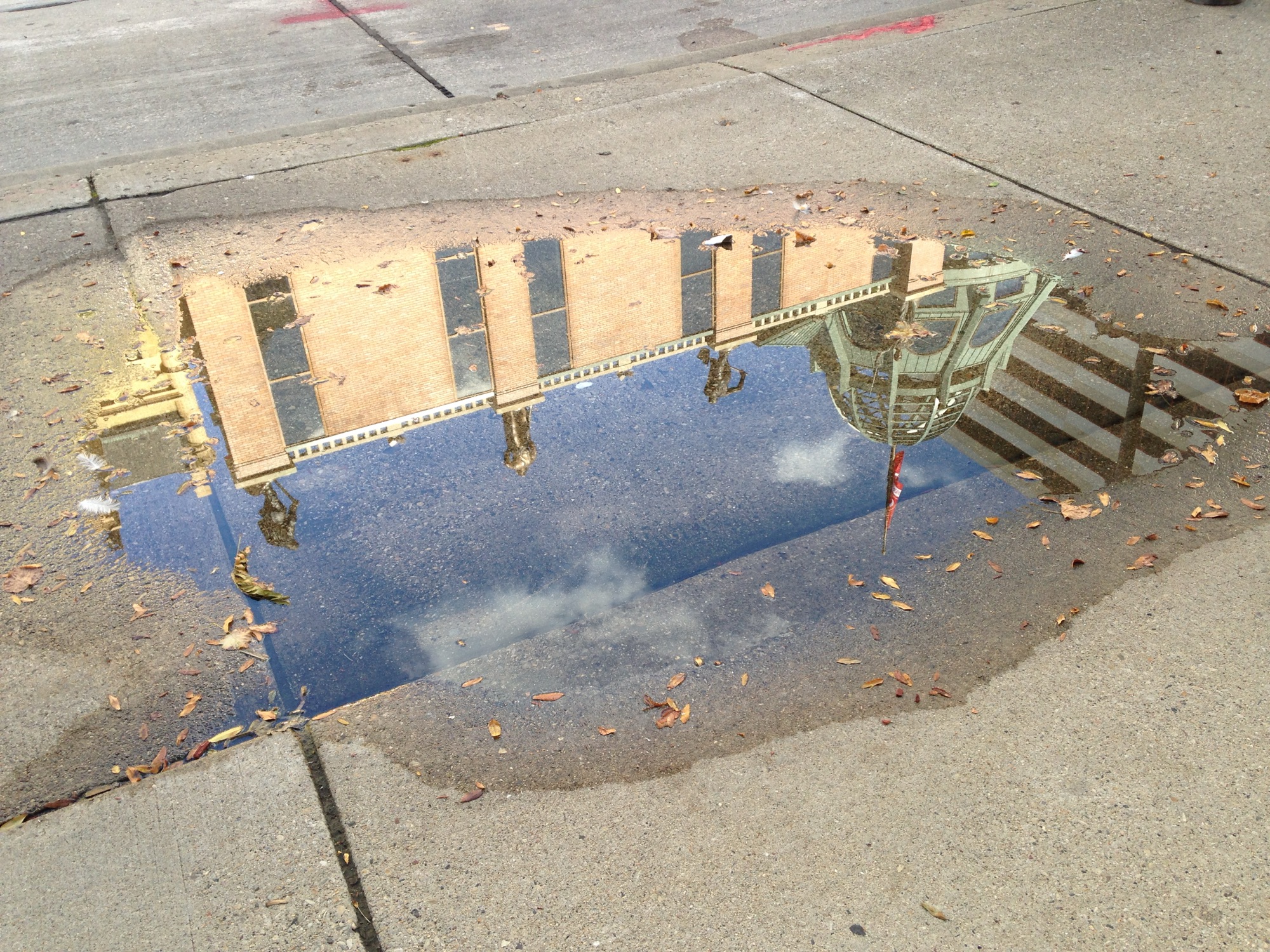 Now, there have been many puddles over the years in that little depression where the different sections of sidewalk concrete tilt together unevenly. But I usually when see that puddle, it’s on a windy, rainy day, when there’s no calm surface or calm sky to create a clear reflection. Or the puddle’s too small to contain a whole reflection. Or the sidewalk is so crowded with students walking to class that any view of the puddle is blocked. Or there’s so much leaf litter and other debris crowded together in the water that the puddle is more “marsh” than mirror, and a reflection is impossible.
