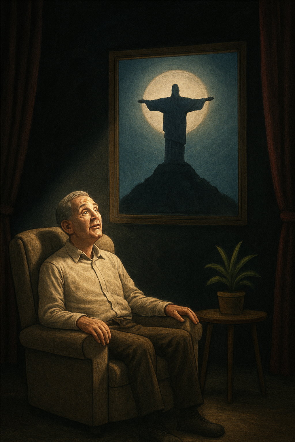 An old man sits in a beige recliner in the spotlight on a shadowed stage beneath a large, framed image of the "Christ the Redeemer" sculpture in Rio de Janeiro