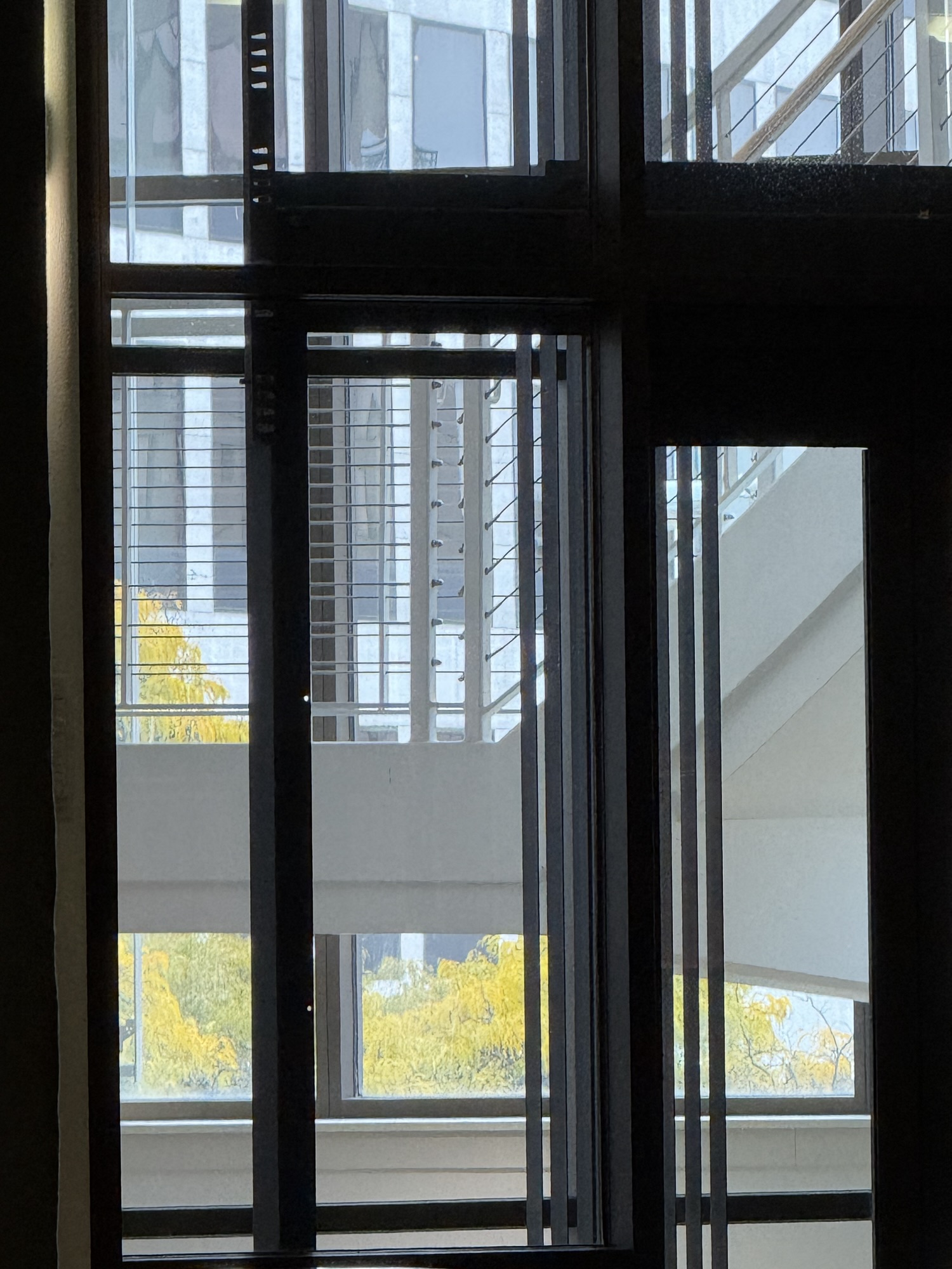 The image below is from today. It’s a view through the elevator shaft in the glass atrium of the Grohmann Museum, the building I work in. I was coming back to my office from getting water for my coffee maker (super busy = lots of coffee) when I happened to glance over across the gallery and noticed all the cool lines of varying angles and thickness.