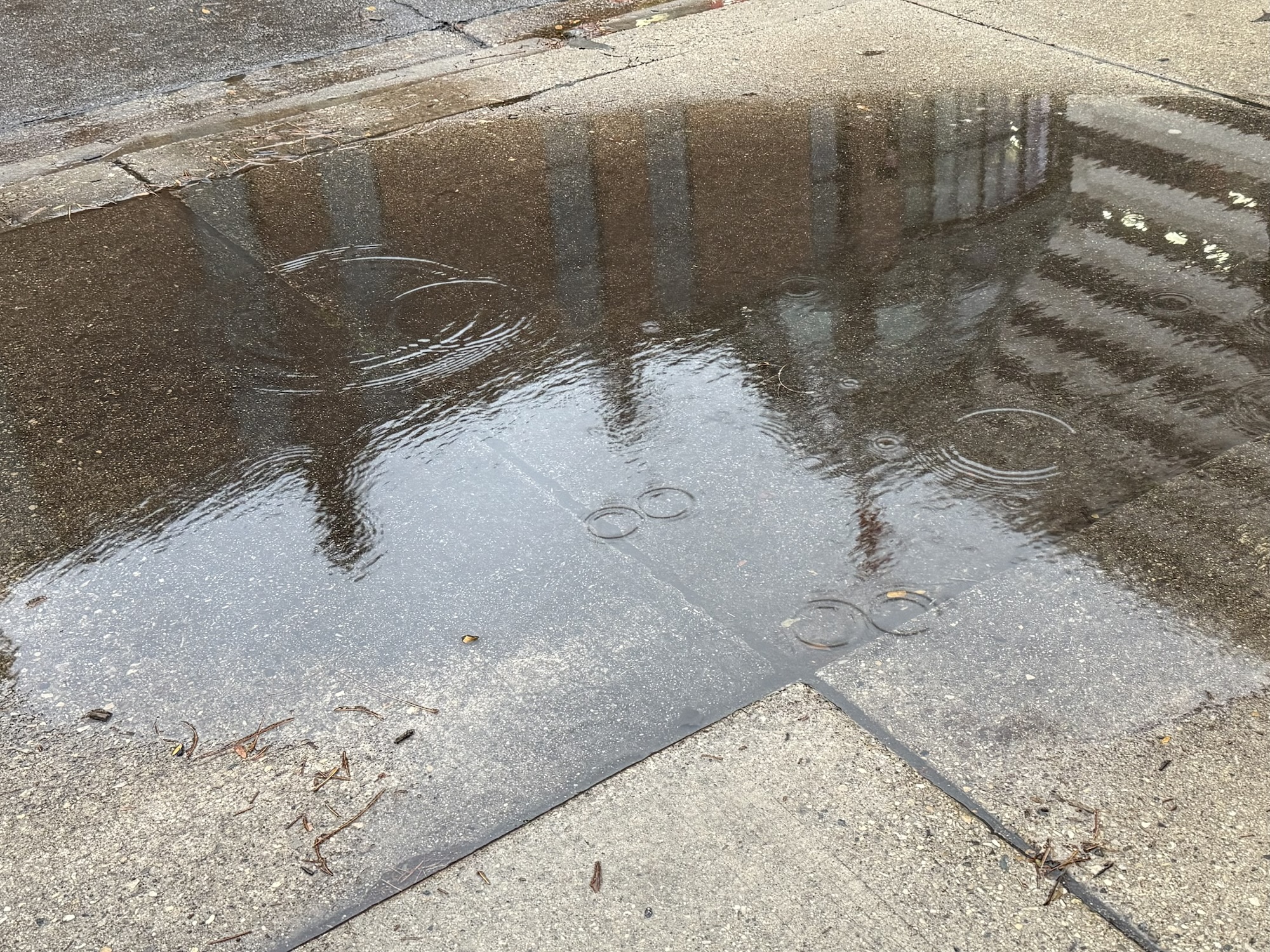 Viewing what your eye captured through the lens is remarkable. When cropped without the cement walk area it gives the look of an impressionist painting with the concentric circles from the raindrops giving it a contemporary feel. Crop it & print it. I could see that for MSOE advertisement or article in a publication.