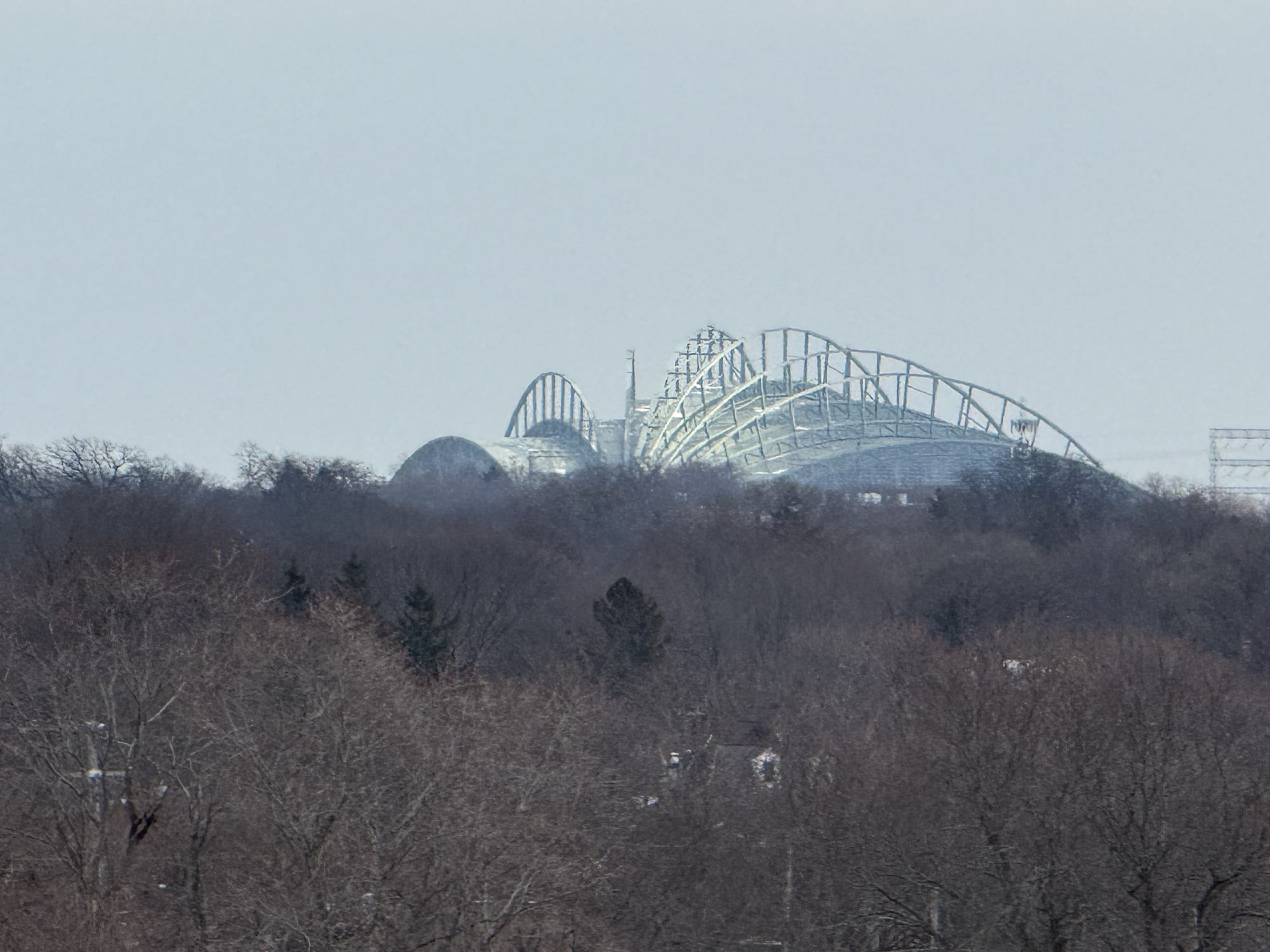 One last photo, not of downtown but of Miller Park, newly named (as of 2020) American Family Field. Apparently it’s the only ballpark with a fan-shaped retractable roof, according to Wikipedia anyway. That feature is clearly distinct in the photo, and you can see that the roof was closed that day. Miller Park (as I still think of it) is due west of Potawatomi, around 44th Street, so approximately 45-40 blocks southeast from where I was standing.