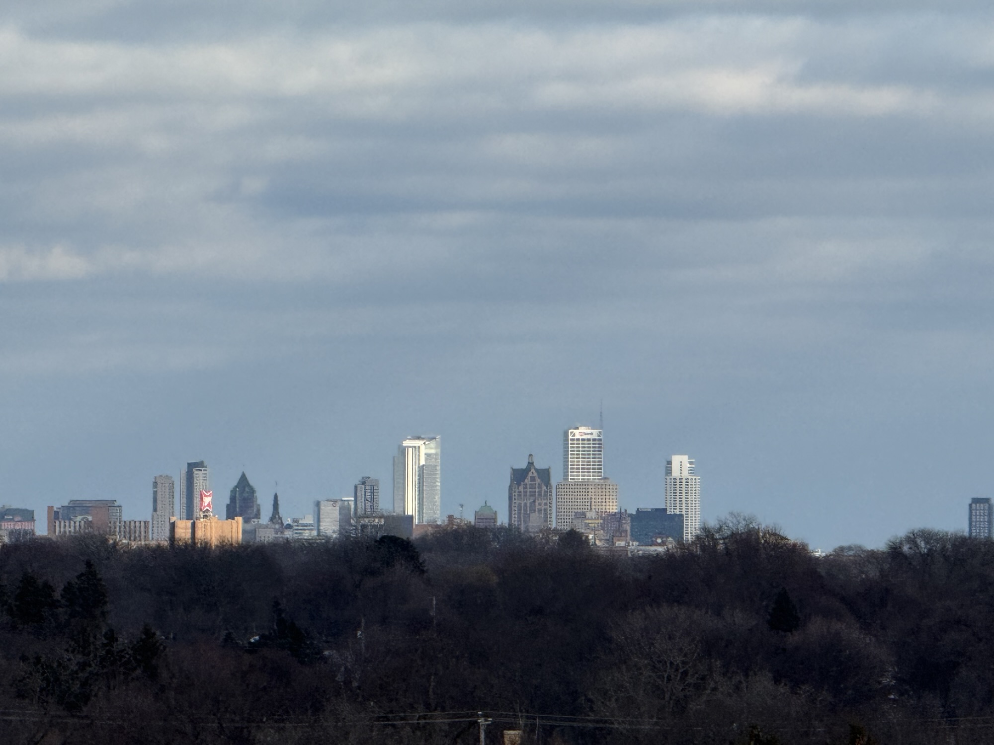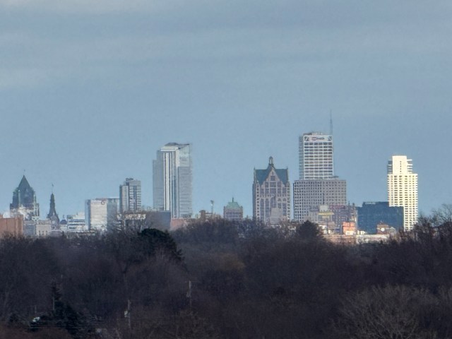 See the light brown building topped with the red and white sign in the left third of the photo? That’s Miller Brewing, which is over 25-45 city blocks away from those tall downtown buildings (25+ from the nearest at around 10th Street and 45-ish from the tall buildings on the right side of downtown proper, which is about 18 blocks east of 10th and about 7 blocks south.)