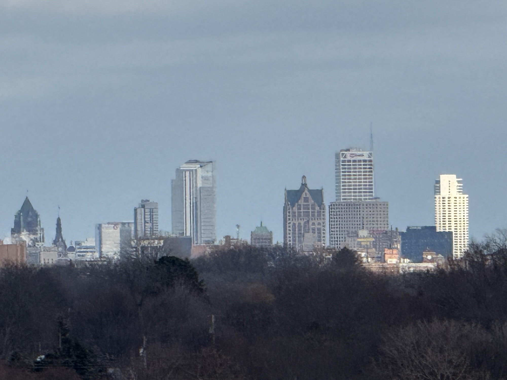 These photos really demonstrate the way a telephoto lens compresses distance. I was standing at approximately 87th Street. Miller Brewing is around 37th or so. Downtown runs from about 10th Street on the west, then 10 blocks to the Milwaukee River, which is the dividing line between east and west, and then about 9 or 10 additional blocks east from the river to Lake Michigan. The U. S. Bank building (tallest building in the photo, white, with its name in blue and red across the top, and also the tallest building in Wisconsin) is at 777 E. Wisconsin, and the buidling to its right is the Couture (tallest apartment building in the state, according to Wikipedia), located at 909 E. Michigan.