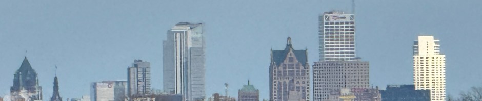 I’m not sure what the building at the far right of the photo above is. It’s possible that it’s Bay View Terrace, a lonely high-rise apartment building (now condos, actually) just south across the Hoan Bridge (crossing the Milwaukee Harbor and associated land) from downtown. But it looks more like the Potawatomi Hotel Casino, which is located less far south of downtown and is also in the 1700 block west (on Canal Street, in the Menomonee Valley, once aka the “Industrial Valley,” although its industrial heyday is long past and efforts are underway to restore the natural marshland environment.