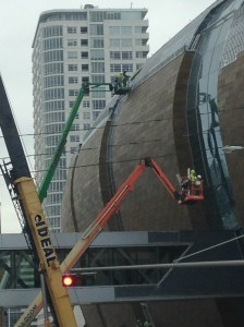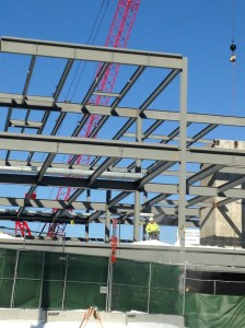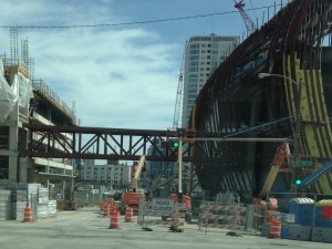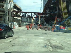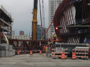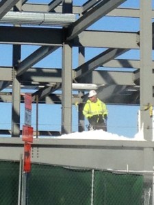Now that I’d started taking pictures, I began noticing progress and documenting it whenever something seemed interesting. These photos were taken in mid March 2017, following a snowstorm. We’re actually looking at the Bucks training facility here, which is kitty-corner across the street from Fiserv Forum. Construction in Wisconsin sometimes requires snow blowing the girders.