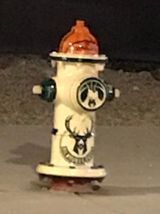 The Deer District has lots of “branding.” They’ve even branded the fire hydrants. The top of this one is a basketball. Not only is it a basketball, it’s a specific brand of basketball. This was a nighttime photo, which I took in early September 2019 when I noticed the Bucks logo the first time. I took a closer look one day during daylight hours and discovered that the orange basketball is a “Spalding” basketball. I wonder if they got some extra money from Spalding to include that 🙂