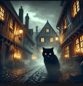 Also, just to spruce up today’s blog post, I asked ChatGPT to generate an image to illustrate my story. My prompt was: “Please create an image to illustrate my “Storm Cat Disease Ideas” story “The Cat in the Rain,” set in the small town in medieval France. The tone should be sinister, malevolent. It should show the village, the black cat, candles in the windows in the early evening, not completely dark. Also, show the mist associated with the cat’s evil presence. Thank you!” (I always say thank you to ChatGPT 😀) The image returned was wonderful, but the cat’s eyes were white. In the story they are golden. So then I had to ask ChatGPT to change them, but then of course, ChatGPT had to change the whole image, because as I’ve learned, ChatGPT can’t keep the entire original the same and change just one thing. It apparently has to generate a whole new version each time, which is frustrating but is the way it works. So now I have a slightly warmer, less sinister image, but hey, I’m definitely grateful to have an image I can use to illustrate, so I need to stop with the complaining!